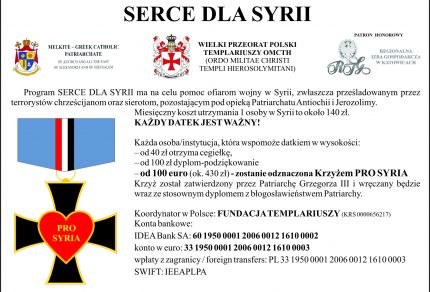 Krzyż Zasługi PRO SYRIA Program SERCE DLA SYRII ma na celu pomoc ofiarom wojny w Syrii, zwłaszcza prześladowanym przez terrorystów chrześcijanom oraz sierotom, pozostającym pod opieką Patria...