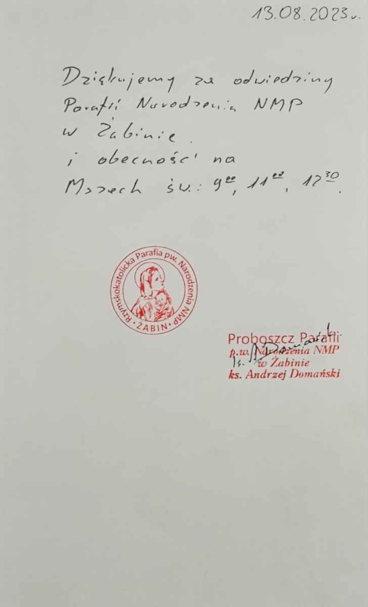 W dniu 13 sierpnia 2023, w wigilię rocznicy męczeńskiej śmierci Świętego Maksymiliana Marii Kolbe, Rycerze Zakonu Templariuszy peregrynowali z relikwiami Świętego Maksymiliana Marii Kolbe w Parafii Narodzenia Najświętszej Maryi Panny w Żabinie (Diecezja ełcka).